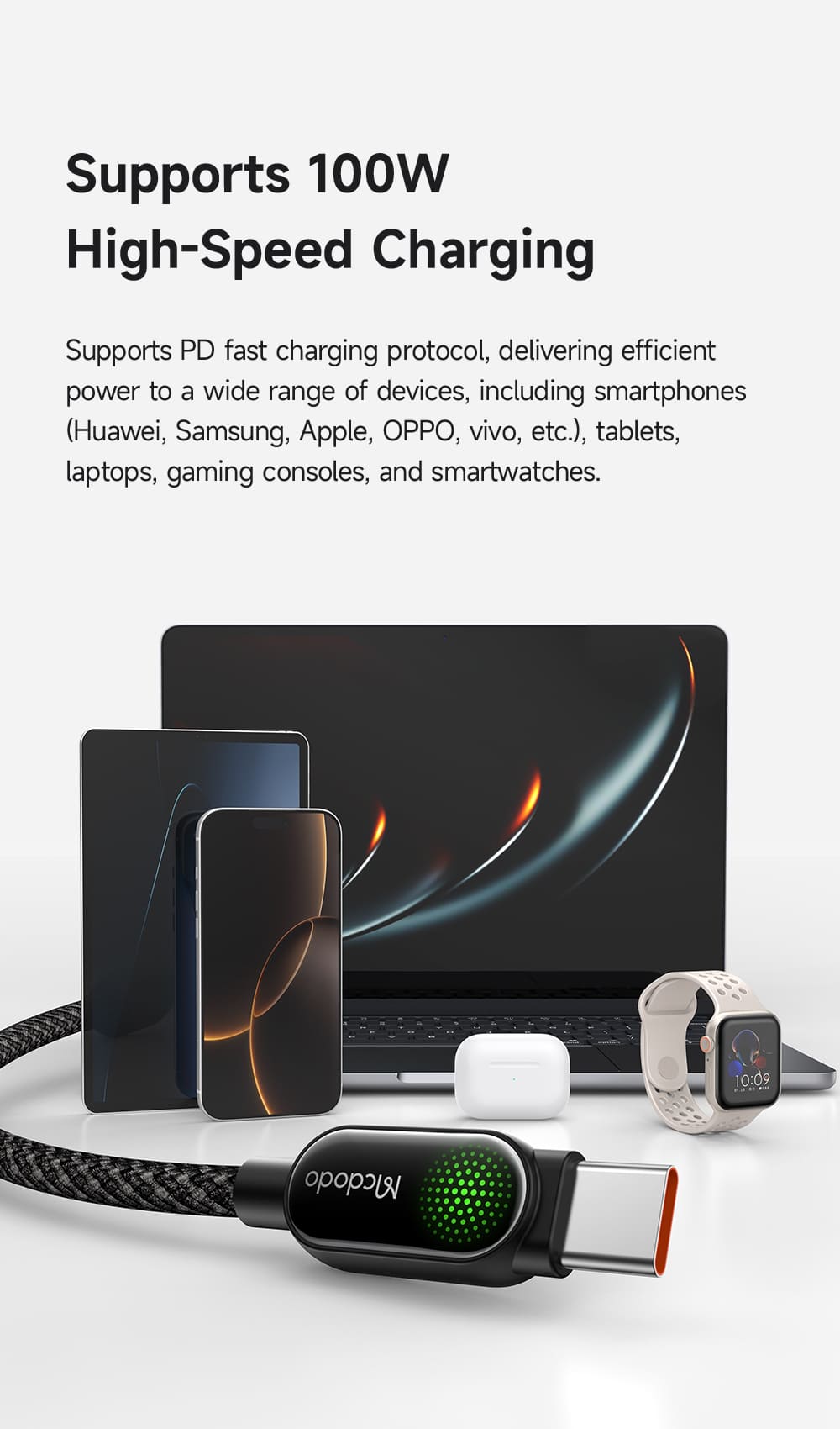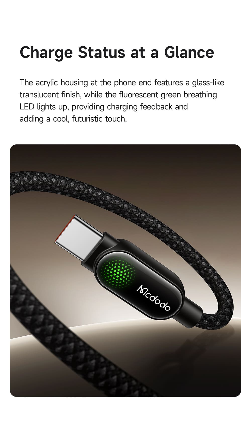 Trải nghiệm sạc nhanh 100W cho mọi thiết bị với phong cách cực ngầu! 💻 Cáp Mcdodo LightSync 100W trang bị đèn LED hiệu ứng "thở" (Breathing LED) màu xanh lá huỳnh quang độc đáo, giúp bạn dễ dàng biết trạng thái sạc. Tích hợp chip E-Marker, sợi cáp này sạc an toàn cho cả laptop, máy tính bảng và điện thoại. 📱