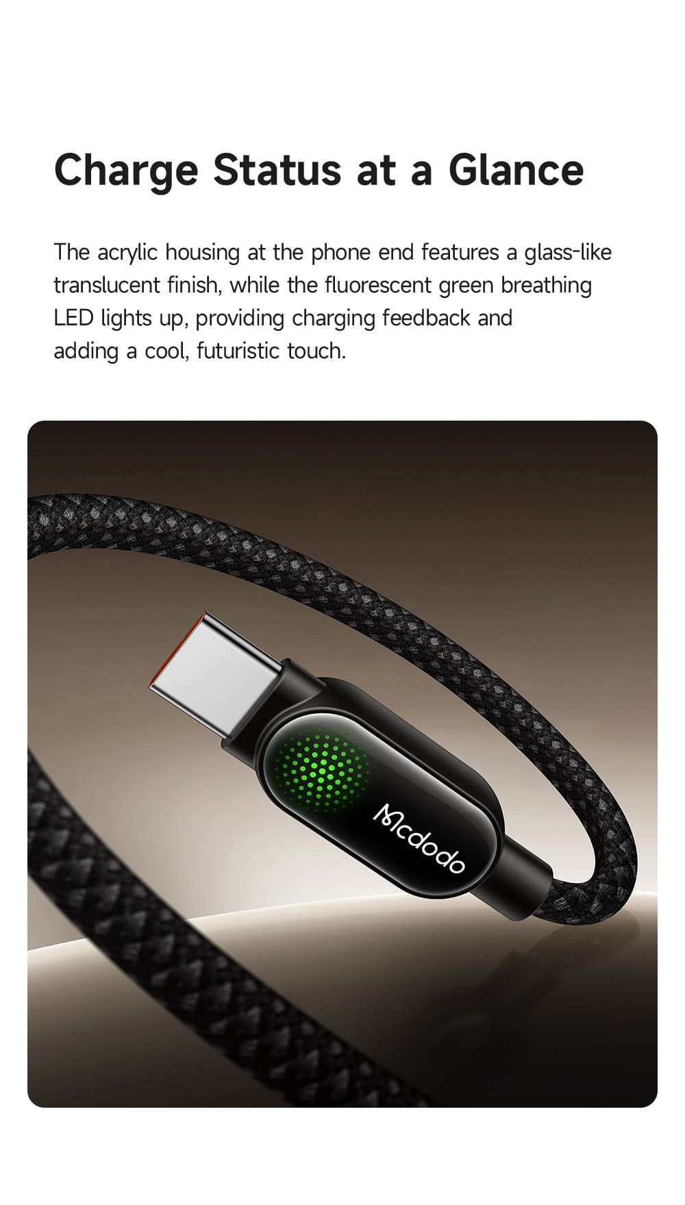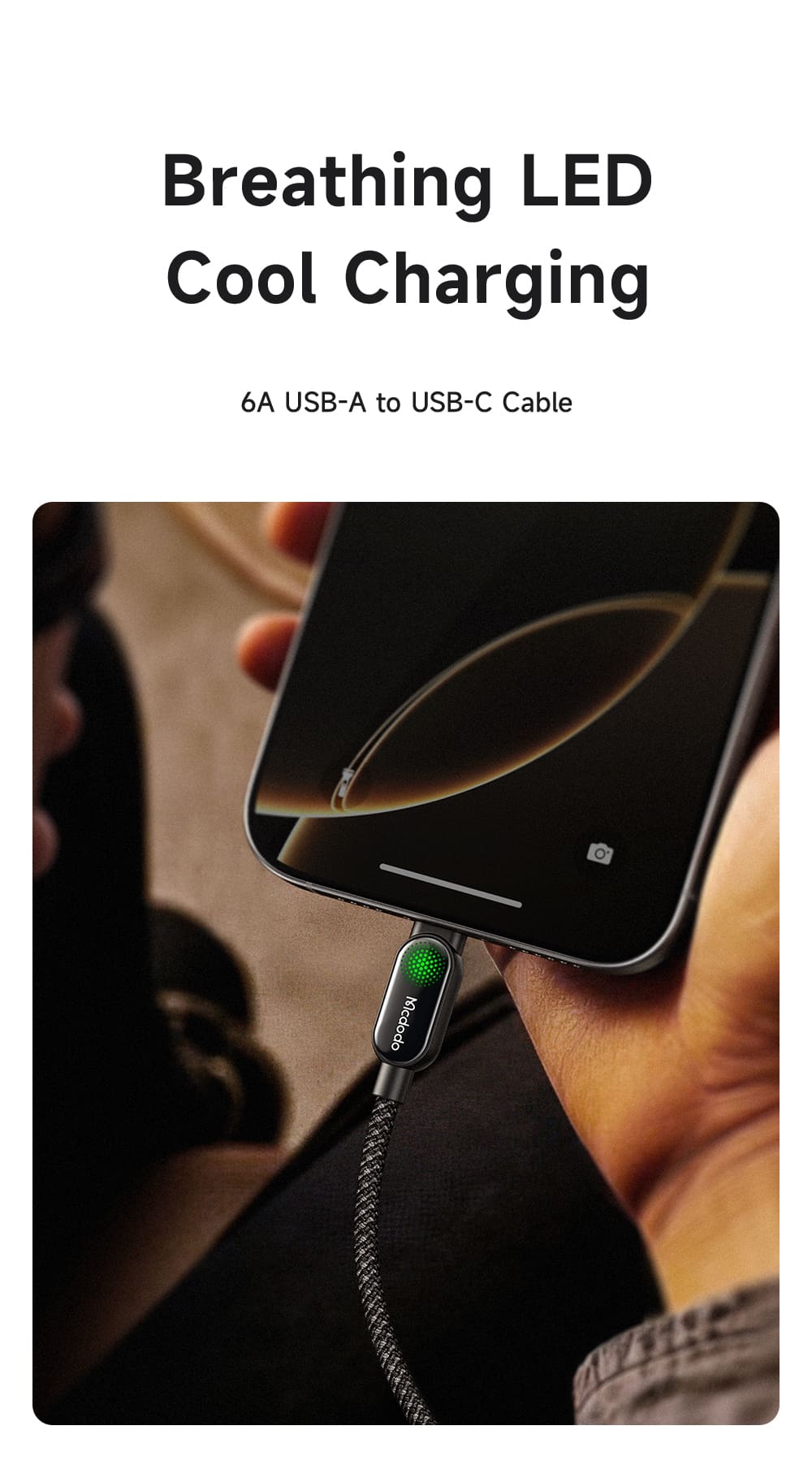 Trải nghiệm sạc siêu nhanh 6A với phong cách cực ngầu! 💡 Cáp Mcdodo LightSync 6A trang bị đèn LED hiệu ứng "thở" (Breathing LED) màu xanh lá huỳnh quang độc đáo, giúp bạn dễ dàng biết trạng thái sạc. Cáp bọc dù siêu bền, hỗ trợ sạc nhanh 6A mạnh mẽ cho các thiết bị của bạn. 📱