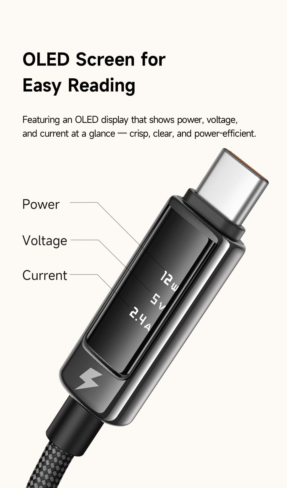 - 📺 Màn hình OLED sắc nét: Trang bị màn hình kỹ thuật số OLED (Full Display) có độ tương phản cao, ít chói. Màn hình hiển thị trực tiếp và chính xác 3 thông số: Công suất (W), Điện áp (V) và Dòng điện (A), giúp bạn nắm rõ tốc độ sạc thực tế của thiết bị.