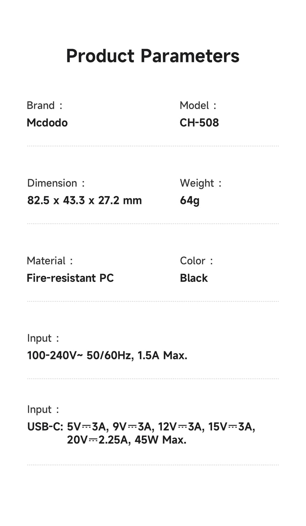 | Type-C Output | 5V-3A, 9V-3A, 12V-3A, 15V-3A, 20V-2.25A, 45W Max. |