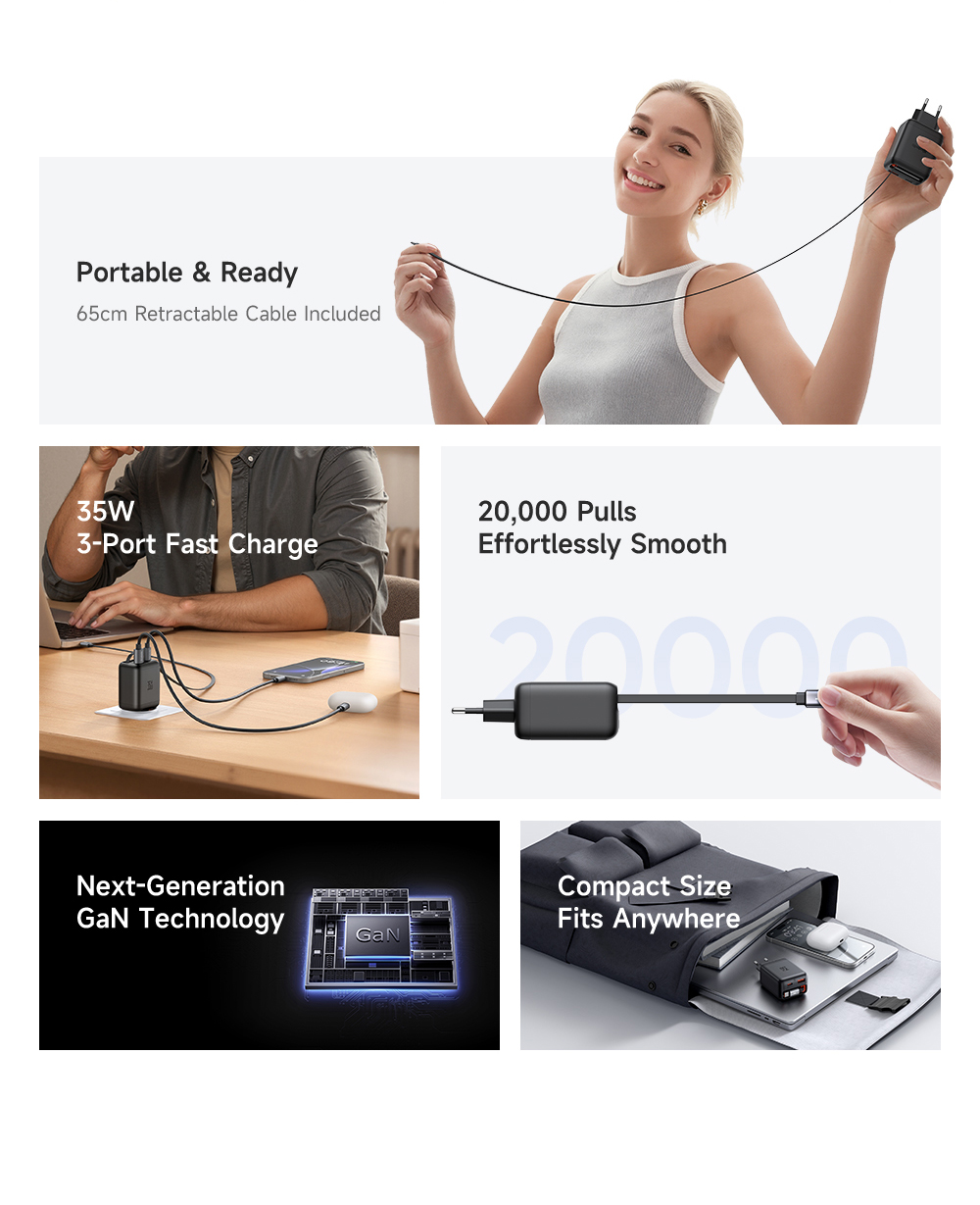 Công suất 35W: Đảm bảo sạc nhanh cho điện thoại, máy tính bảng và các phụ kiện.