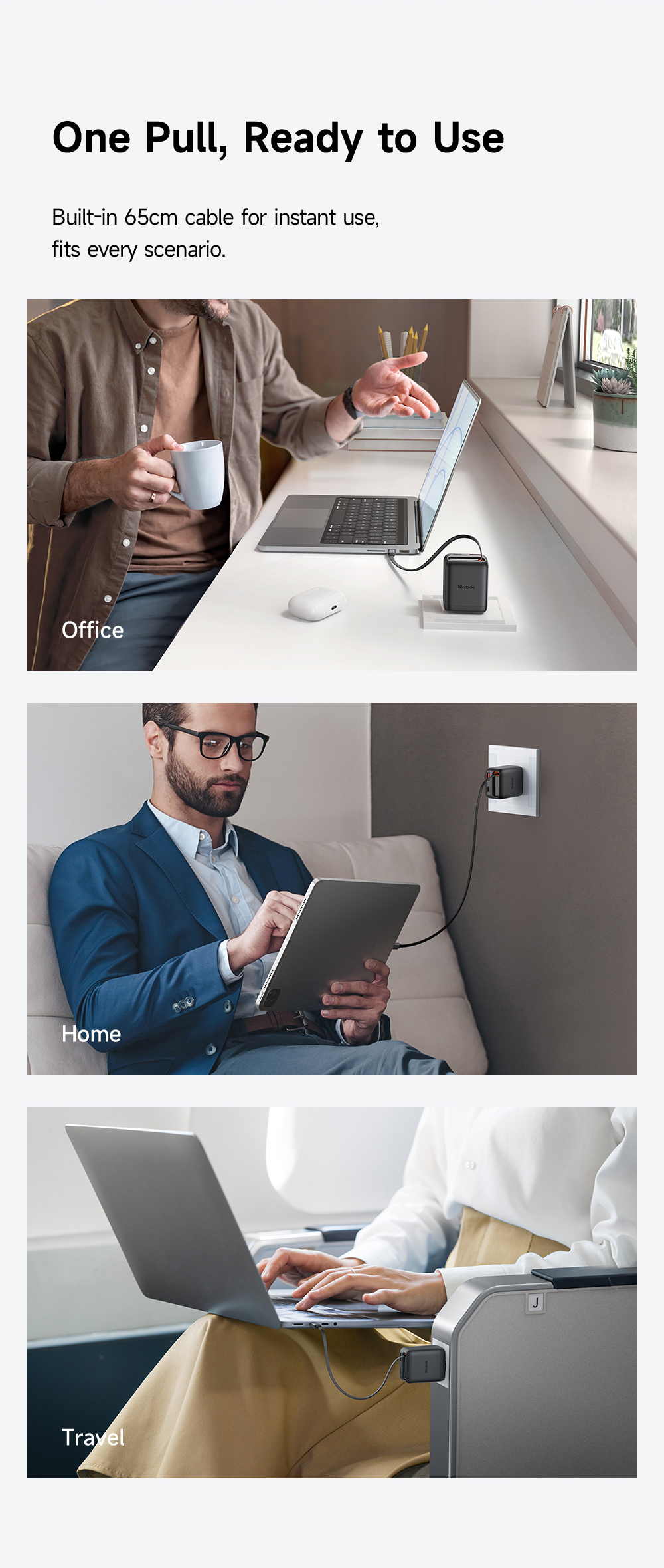 Thiết kế 3 trong 1: Sạc đồng thời 3 thiết bị qua 1 dây rút và 2 cổng cắm rời (1 USB, 1 Type-C).