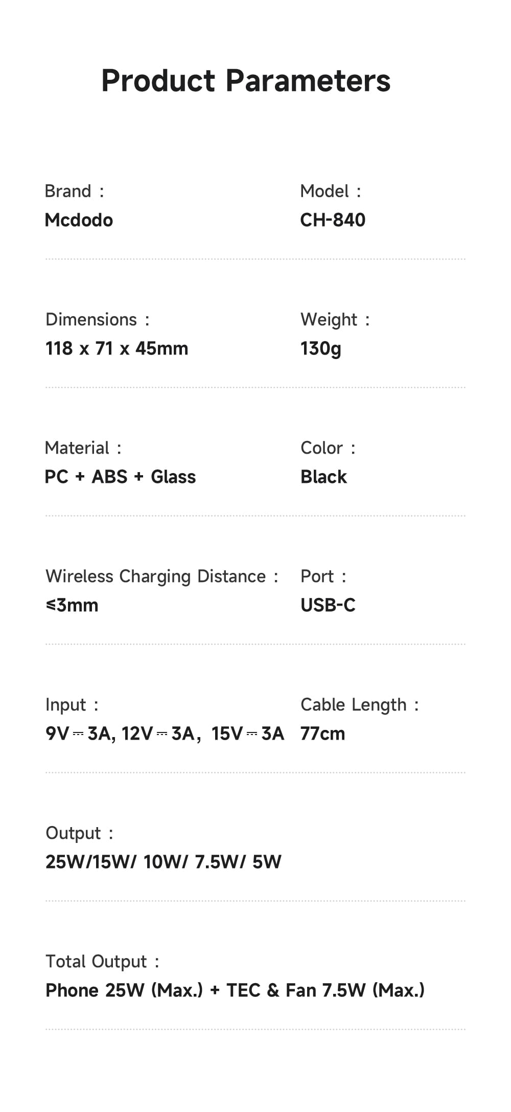 | Output | 25W / 15W / 10W / 7.5W / 5W |