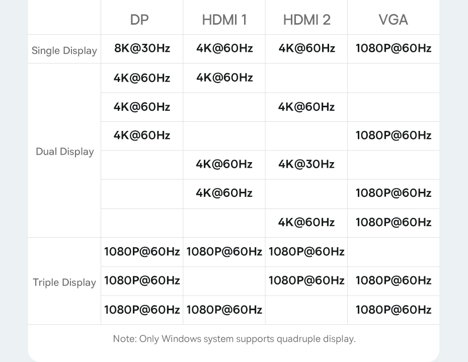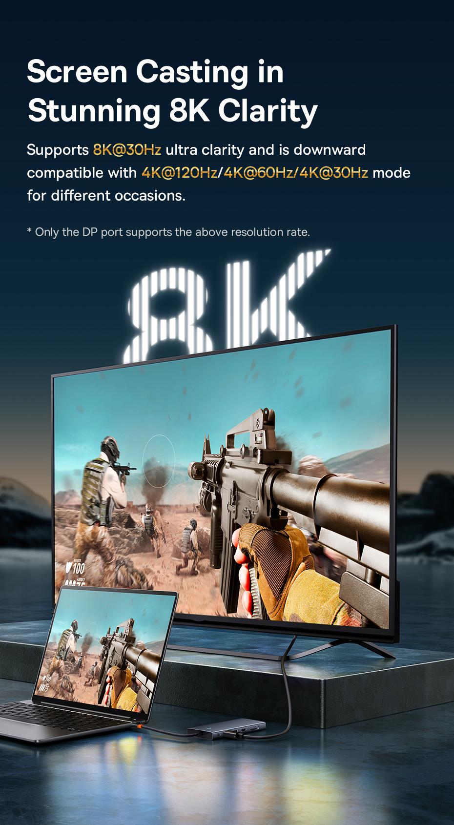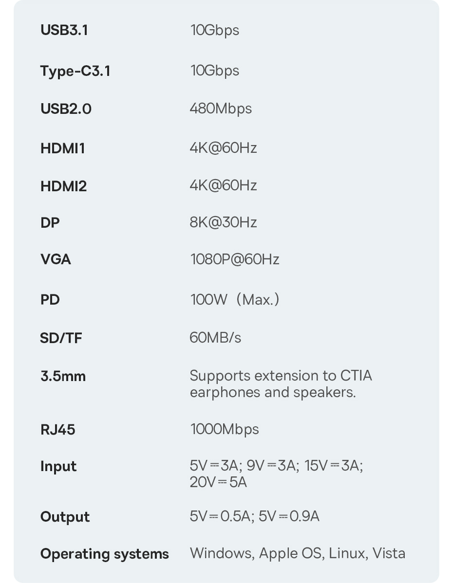 ✔️ Các cổng kết nối của Hub: PD 100W, DP 4K@120Hz / 4K@60Hz, HDMI x2, SD / TF, Type-C 3.1, USB3.1 x2, USB2.0, 3.5mm, VGA, RJ45 1000Mbps