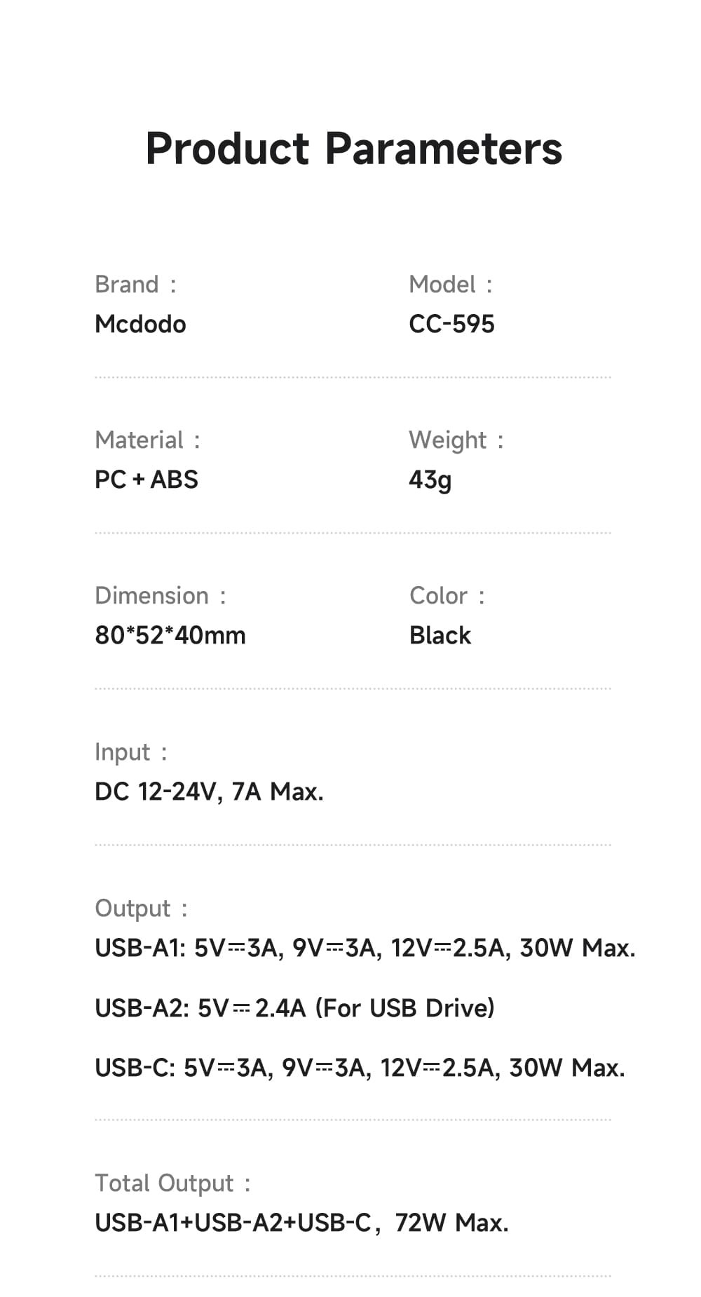 | Type-C Output | 5V-3A, 9V-3A, 12V-2.5A 30W Max. |