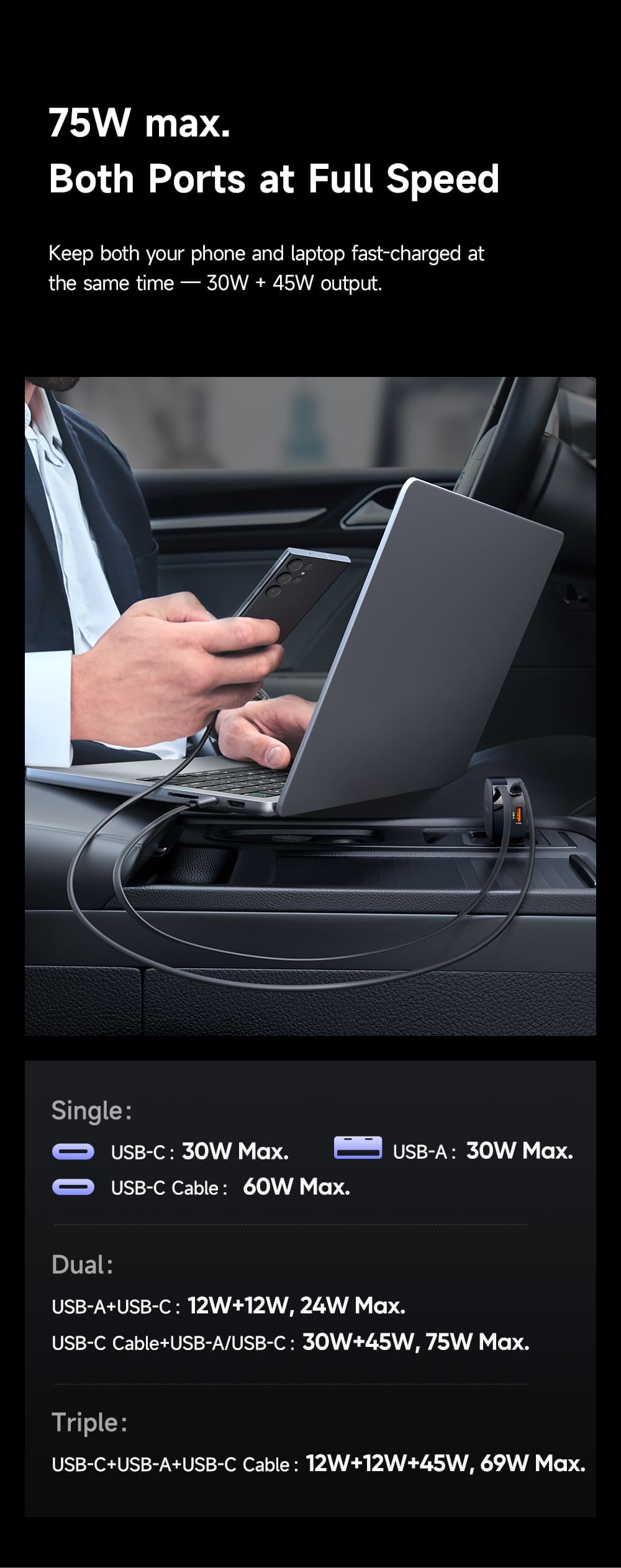 | Type-C / USB + Type-C Cáp Output | 30W + 45W, 75W Max. |