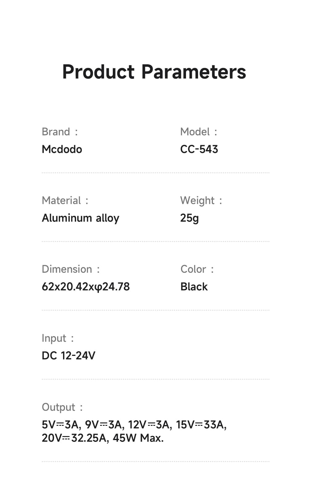 | Type-C Output | 5V-3A, 9V-3A, 12V-3A, 15V-3A, 20V-2.25A, 45W Max. |