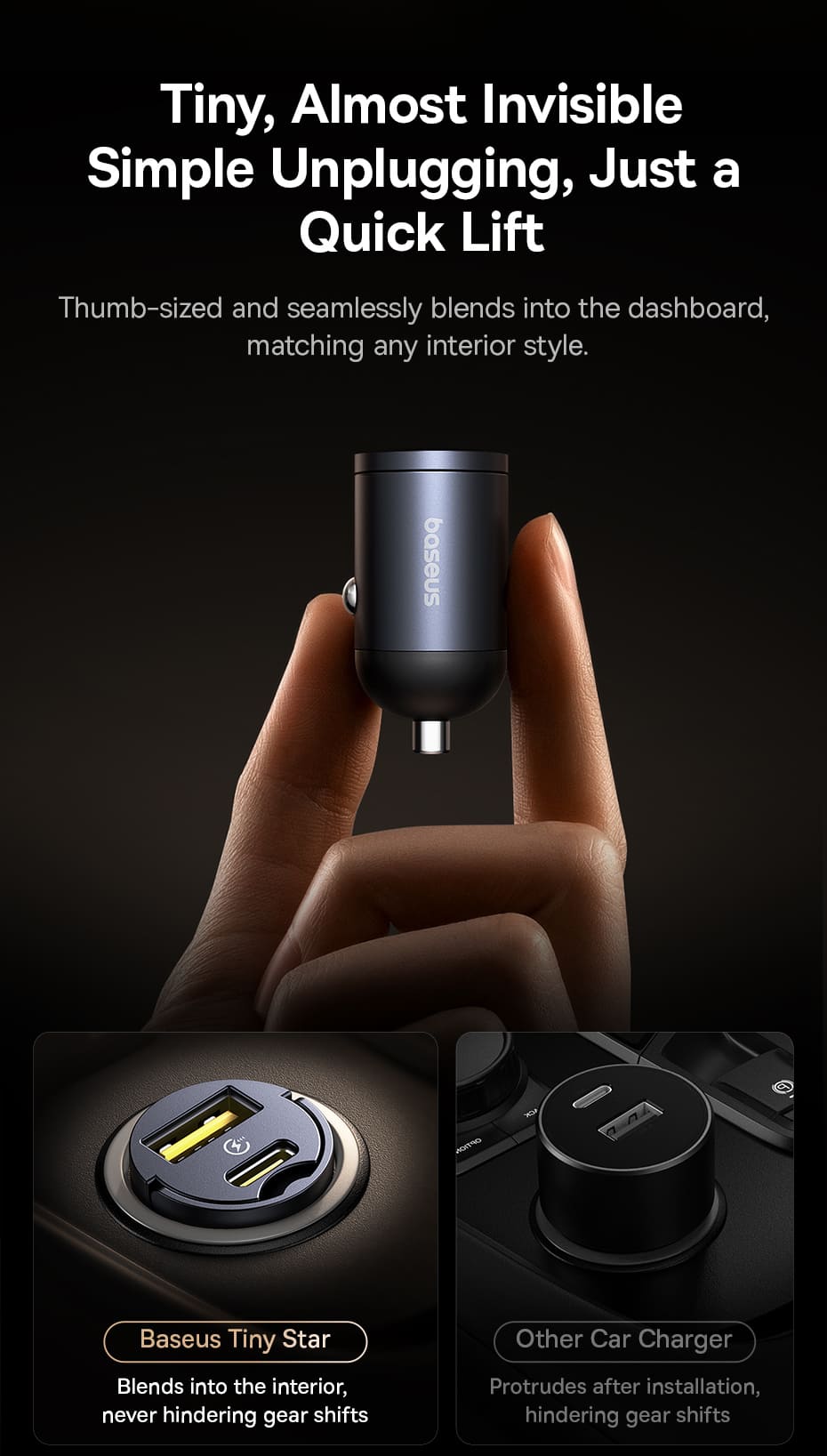 Bạn khó chịu với những củ sạc ô tô to và thô kệch làm mất đi vẻ đẹp nội thất xe? Tẩu Sạc Baseus Tiny Star Mini chính là định nghĩa mới về sự tinh tế và gọn gàng! Với thiết kế siêu nhỏ, gần như "tàng hình" trong hộc sạc, đây là phụ kiện không thể thiếu cho một không gian xe hơi hiện đại và tối giản.