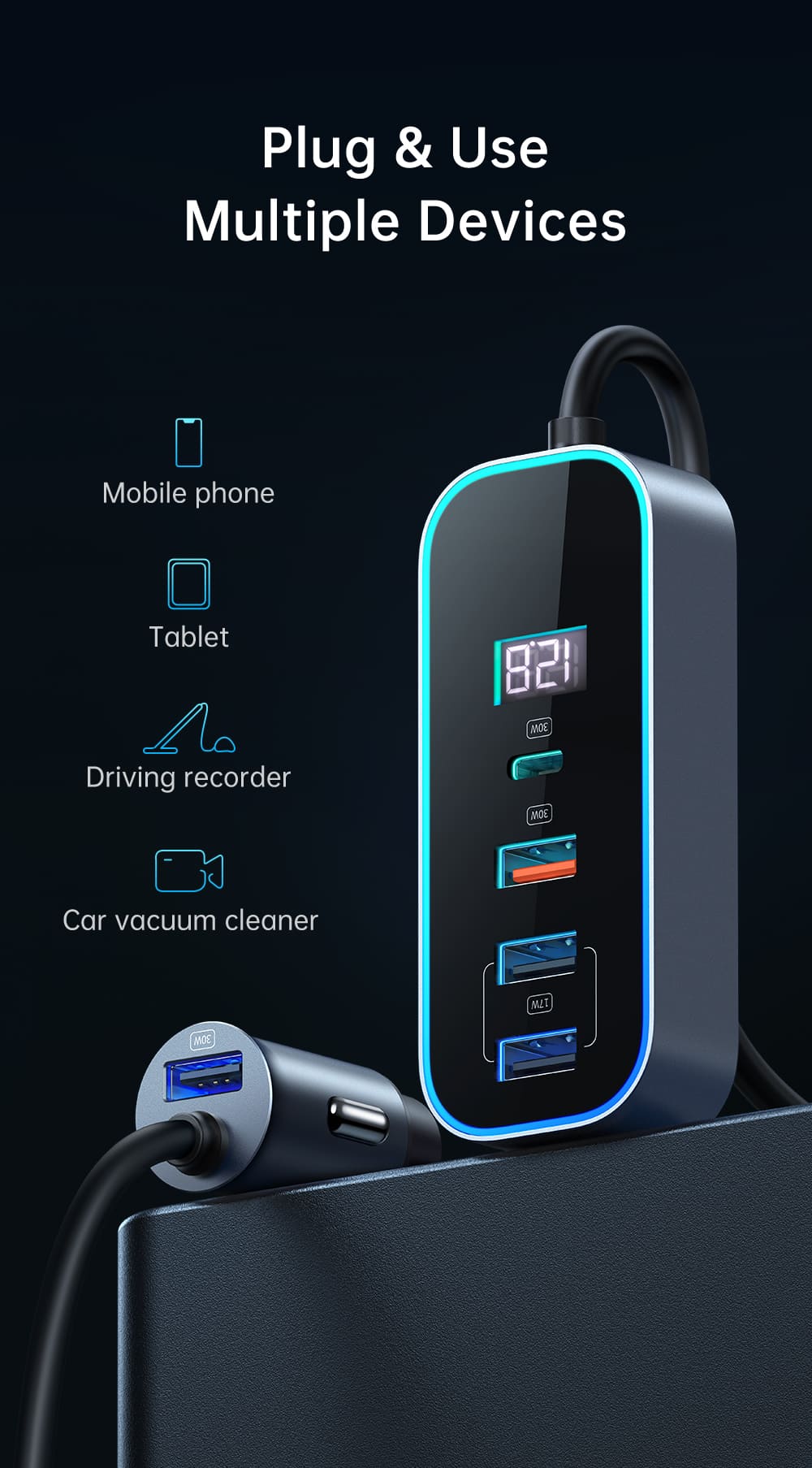 Bạn có thấy bất tiện khi hàng ghế sau không có cổng sạc? 🚗 Tẩu sạc Mcdodo 107W là giải pháp hoàn hảo! Với thiết kế 2 mảnh độc đáo gồm tẩu cắm (1 cổng) và hub sạc (4 cổng) nối bằng dây 1.5m, sản phẩm này sạc nhanh cho 5 thiết bị cùng lúc. Hub sạc có màn hình LED báo điện áp và viền RGB cực kỳ hiện đại. 📱