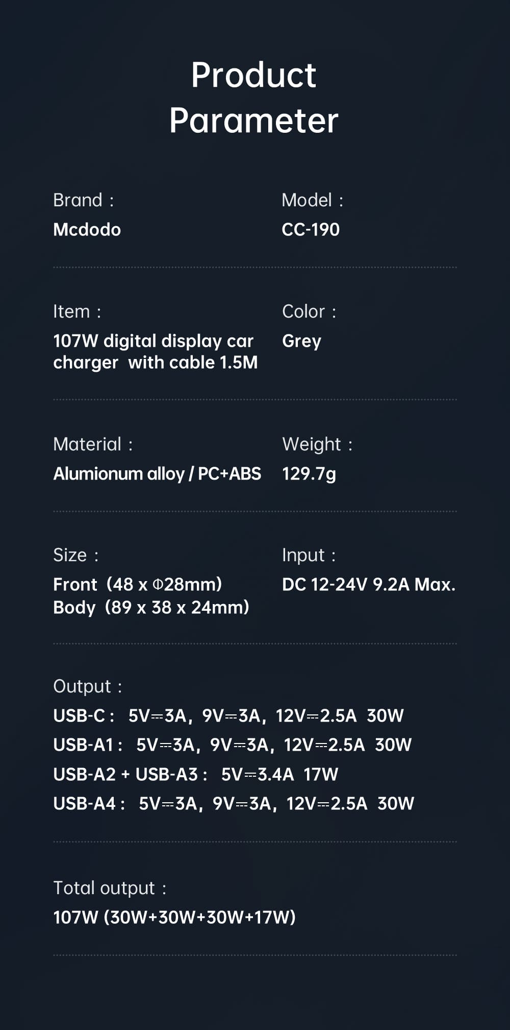 | Total Output | 107W (30W + 30W + 30W + 17W) |